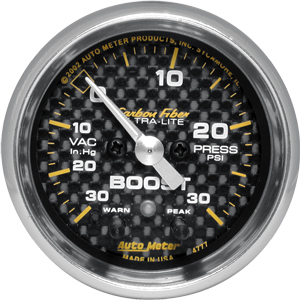 Autometer Carbon Fiber Full Sweep Electric Boost / Vacuum gauge 2 1/16" (52.4mm)Product OverviewProduct Details: 2" Boost-Vac, 30 In. Hg/ 30 Psi, Carbon Fiber Buy Together and Save $31.70 |