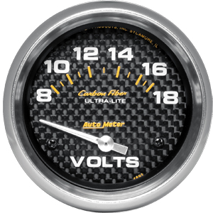 2-5/8" Voltmeter, 8-18v, Elec, Carbon Fiber Voltmeter Product # 4891 Size: 2 5/8" (66.7mm) Type: Short Sweep Electric Range: 8 - 18 Volts