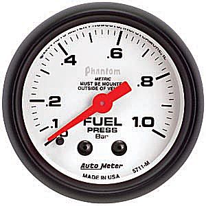 2" Fuel Press, 0-1.0 Bar Mech, Phantom Fuel Pressure Product # 5711-M Size: 2 1/16" (52.4mm) Type: Mechanical Range: 0 - 1.0 Bar Notes: Requires #4 braided hose and mounting cup. Must be mounted outside vehicle.