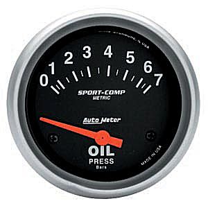 2-5/8" Oil Press, 0-7 Bars, Elec Oil Pressure Metric Product # 3522-M Size: 2 5/8" (66.7mm) Type: Short Sweep Electric Range: 0-7 Bar Notes: Includes 1/8" NPT Sender. Air-Core meter movement. Includes 1/4'' NPT adapter/fittings.