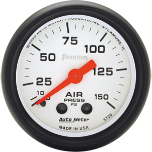 2" Air Press, 0-150 Psi, Mech, Phantom Air Pressure Product # 5720 Size: 2 1/16" (52.4mm) Type: Mechanical Range: 0-150 PSI Notes: Includes 6 ft. nylon tubing with 1/8" NPT fittings. Includes 1/4'' NPT adapter/fittings.