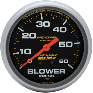 2-5/8" Blower Press, 0- 60 Psi, Mech Blower Pressure Product # 5402 Size: 2 5/8" (66.7mm) Type: Liquid Filled Mechanical Range: 0-60 PSI Notes: Includes 6 ft. nylon tubing with 1/8" NPT fittings. Includes 1/4'' NPT adapter/fittings.