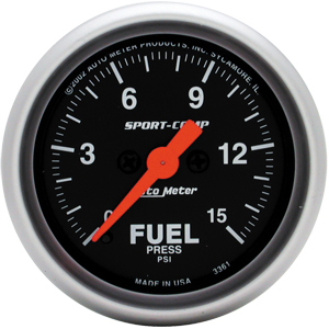 2" Fuel Press, 0-15 Psi, W/O Peak & Valley Fuel Pressure Product # 3361 Size: 2 1/16" (52.4mm) Type: Full Sweep Electric Range: 0-15 PSI ] Notes: Full Sweep, Stepper Motor meter movement. Includes 1/8" NPT Sender.