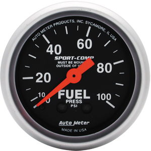 2" Fuel Press, 0-100 Psi Mech, Sport-Comp Fuel Pressure Product # 3312 Size: 2 1/16" (52.4mm) Type: Mechanical Range: 0-100 PSI Notes: Requires #4 braided hose and mounting cup. Must be mounted outside vehicle