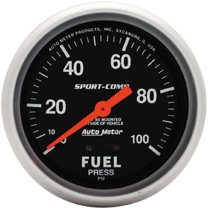 Product Details: 2-5/8" Fuel Press, 0-100 Psi, No Tubing, Mech Fuel Pressure Product # 3412 Size: 2 5/8" (66.7mm) Type: Mechanical Range: 0-100 PSI Notes: Requires #4 braided hose and mounting cup. Must be mounted outside vehicle.