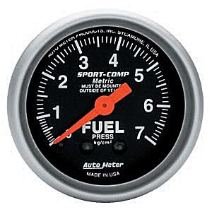 Product Details: 2" Fuel Press, 0-7 Kg/ Cm2 Fuel Pressure Metric Product # 3312-J Size: 2 1/16" (52.4mm) Type: Mechanical Range: 0-7 Kg/Cm2 Notes: Requires #4 braided hose and mounting cup. Must be mounted outside vehicle.