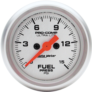 2" Fuel Press, 0-15 Psi, W/O Peak & Valley, Elec Fuel Pressure Product # 4361 Size: 2 1/16" (52.4mm) Type: Full Sweep Electric Range: 0-15 PSI Notes: Full Sweep, Stepper Motor meter movement. Includes 1/8" NPT Sender.