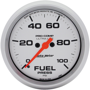 2-5/8" Fuel Press, 0-100 Psi, W/O Peak & Valley Fuel Pressure Product # 4463 Size: 2 5/8" (66.7mm) Type: Full Sweep Electric Range: 0-100 PSI Notes: Full Sweep, Stepper Motor meter movement. Includes 1/8" NPT Sender.