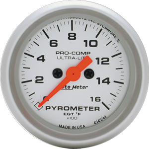 2" E.G.T. Kit, 0-1600`F, Full Sweep Street, Ul Pyrometer Product # 4344 Size: 2 1/16" (52.4mm) Type: Full Sweep Electric Range: 0 -1600 deg. F Notes: Air-Core meter movement. Includes Type K Thermocouple.