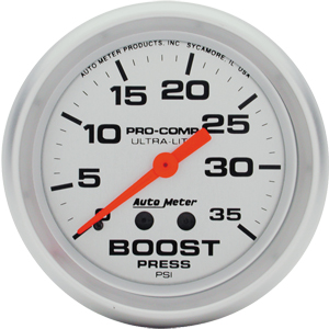 2-5/8" Boost, 0-35 Psi, Mech, Ultra-Lite Boost Product # 4404 Size: 2 5/8" (66.7mm) Type: Mechanical Range: 35 PSI Notes: Includes 6 ft. nylon tubing with 1/8" NPT fittings. Includes 1/4'' NPT adapter/fittings.