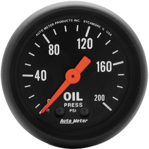 2" Oil Press, 0-200 Psi, Mech, Z-Series Oil Pressure Product # 2605 Size: 2 1/16" (52.4mm) Type: Mechanical Range: 0-200 PSI Notes: Includes 6 ft. nylon tubing with 1/8" NPT fittings. Includes 1/4'' NPT adapter/fittings.